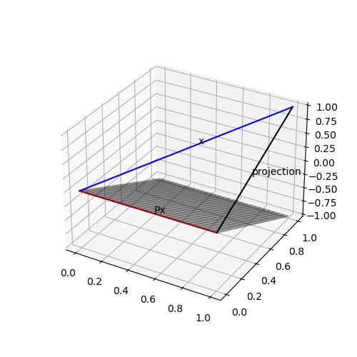 -> 2차원 공간(평면)에서의 최적의 해는 x를 평면으로 Projection한 빨간색 선(Px)가 된다!