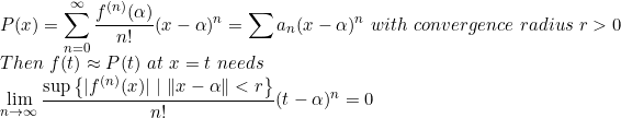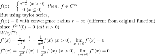 그러나, 이 수렴반경 안에서도 P(x)가 항상 f(x)와 일치한다는 보장은 없다. 일단, 테일러 정리에서 본 오차항은 O(?/n!)이라고는 했는데 supremum을 구할 때, 예상외로 그 값(?)이 n!보다 커질 수도 있기 때문이다....