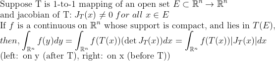 사실, T의 inverse가 locally continuous이고(by 역함수정리), support가 compact였으므로, support를 Inverse 태워 보낸 것도, compact이다. 그러므로, T를 보내기 전, 후 둘 다 Compact set에서 정의되므로, 적분가능성은 보장된다!