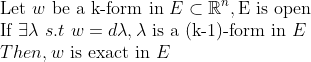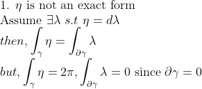 여기에 대한 이야기는 일단 보류를 해야 하는데, 미적분학에서 본 바로는 "star-shape"에서 closed form을 만족하면 exact form이 된다. -> 뒤에 푸앵카레 보조정리에서 다시!